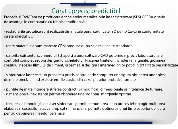 Sinterizarea laser selectivă este o tehnologie promiţătoare care înlocuieşte turnarea convenţională a aliajelor metalice. Selective Laser Sintering (SLS) reprezintǎ o tehnică adiţională care permite generarea unei structuri tridimensionale complexe, prin selectarea consolidată şi succesivă a straturilor de pudră (praf) metalică, şi lipirea strat cu strat unul deasupra celuilalt, folosind energie termică furnizată de o rază laser focalizată computerizat. Prin această tehnologie se pot realiza design-uri complexe pentru infrastructuri protetice fixe, mobilizabile, suprastructuri protetice pe implanturi, suprastructuri pentru epiteze faciale, etc., având o deosebită biocompatibilitate şi o precizie de adaptare net superioară scheletelor metalice fabricate prin procedeele convenţionale (de ex: turnare).